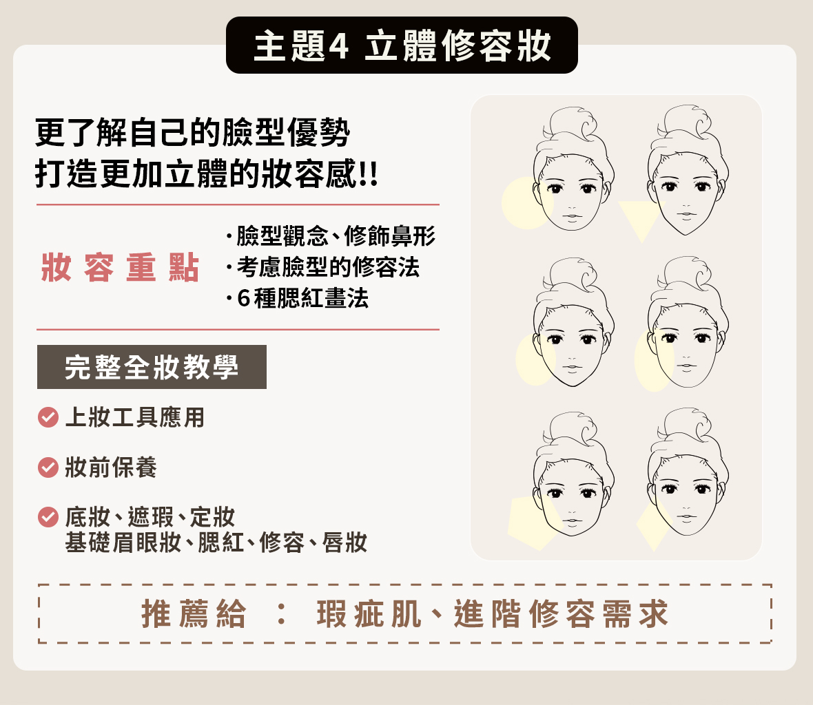 課程內容:帶你更了解自己的臉型優勢,上完課後才知道自己是哪一種臉型,長形臉、鵝蛋臉、方形臉、菱形臉、橢圓形臉等等,因為臉型並非對稱,每種臉型適合的修容、腮紅及打亮位置也不同,從課程中可以學到更完整的五官輪廓修飾法,打造更加立體的妝容感!