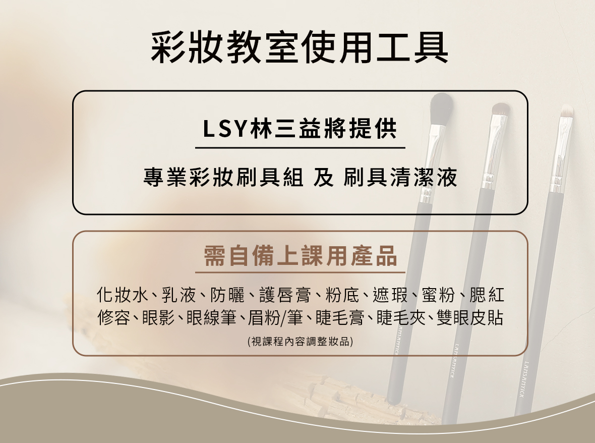 【注意事項】 ※ 報名付款後,須加入林三益官方LINE@,提供個人資訊 (報名姓名/手機/Email/上課主題名稱/上課日期) ,開課前三天發送開課資訊,憑通知現場報到 ※ 若因個人因素無法前往,可轉讓資格給朋友,需於開課前七天(不含假日)事前向林三益官方LINE@通知,如未通知且當日未到者,不予補課及退費 ※ 課程時間:14:00-17:00 (3小時),上課地點:台北市中山雙連捷運站,步行約6分鐘 ※ 本課程為專屬客制,一旦售出不另行退費,若因氣候因素而無法參與課程,可協議上課時間 ※ 為尊重其他學員,請勿遲到或於課堂期間干擾上課,遲到及未到者視同放棄,不予補課及退費 ※ 為確保上課品質,4人開班,若不足4人時另協調時段開班,於開課前五天通知學員 ※ 課程另贈當日購物金500元及刷具清潔液(乾洗、水洗各一,隨機贈送不可挑選) ,購物金限於當日課後現場購物使用,逾期無效,消費金額如低於購物金,恕不退差額 ※ 本課程可使用會員購物金折抵,恕無法與滿額贈品/現折、折價劵、優惠序號合併使用 ※ 本課程由林三益提供上妝刷具,學員上課時需自備習慣保養品、彩妝品、其他上妝工具 ※ 為尊重智慧財產權,請留意課程進行時無法錄音、錄影,但可以拍照記錄 ※ 學員肖像、姓名及課程錄影照片,除基於宣傳用途之播放、展出或登載行為外,不另做其他用途 ※ 林三益保有延後、調整上課日期之權利,如有任何未盡事宜,林三益將另行公告 ※ 完成報名繳費之學員,視為同意以上注意事項 |