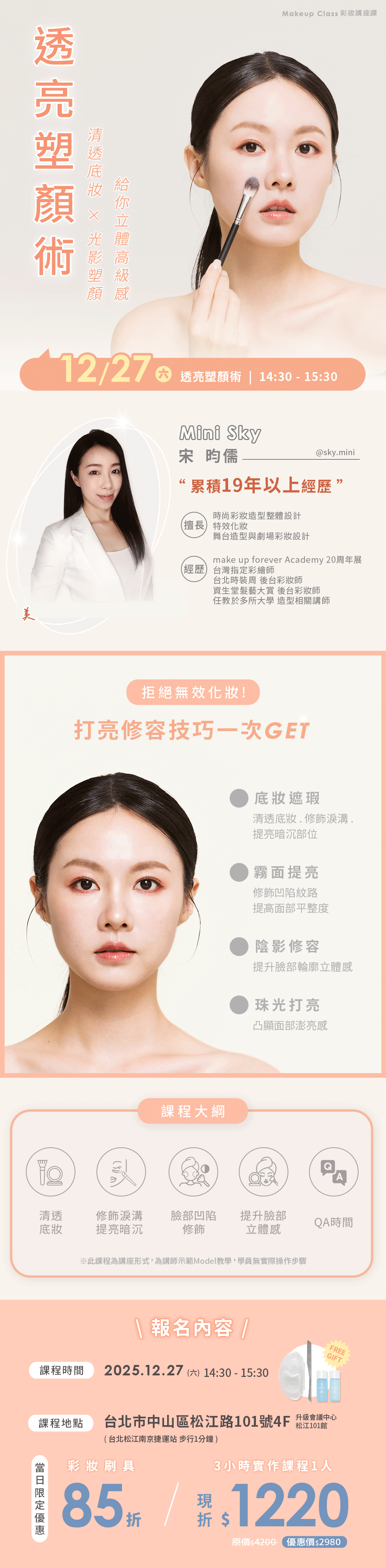 台北彩妝講座課報名注意事項: ※ 報名付款後,須加入林三益官方LINE@,提供個人資訊 (報名姓名/手機/Email/上課主題名稱/上課日期) ,開課前5日發送課前資訊,憑通知於現場報到 ※ 本課程為講座形式,由講師示範Model教學,學員無實際操作步驟 ※本講座課程由林三益提供課程贈品及講義,學員上課時僅需自備筆 ※ 報到時間為開課前10分鐘入場 ※ 本課程為實名制,一旦售出不另行退費 ※ 為尊重其他學員,請勿遲到或於課堂期間干擾上課,遲到及未到者視同放棄,不予退費與補課 ※ 為尊重智慧財產權,請留意課程進行時無法錄音、錄影, 但可以拍照記錄 ※ 學員肖像、姓名及課程錄影照片除基於宣傳用途之播放、展出或登載行為外,不另做其他用途 ※ 完成報名繳費之學員視為同意以上注意事項 ※ 現場購課須知,僅提供現金、刷卡、LINE PAY付款 | |||