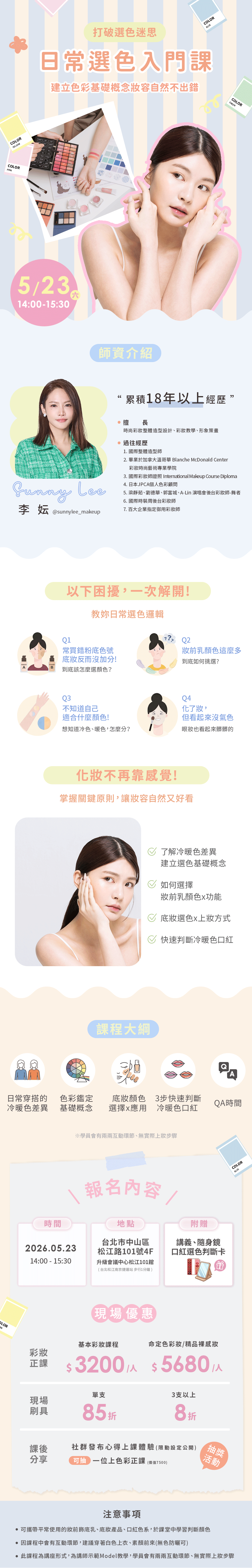 色彩講座【日常選色入門課】報名注意事項: ※ 報名付款後,須加入林三益官方LINE@,提供個人資訊 (報名姓名/手機/Email/上課主題名稱/上課日期) ,開課前5日發送課前資訊,憑通知於現場報到 ※ 本課程為講座形式,由講師示範Model教學,學員會有兩兩互動環節、無實際上妝步驟 ※本講座課程由林三益提供課程贈品及講義,學員上課時僅需自備筆 ※ 報到時間為開課前15-20分鐘入場 ※ 本課程為實名制,一旦售出不另行退費 ※ 為尊重其他學員,請勿遲到或於課堂期間干擾上課,遲到及未到者視同放棄,不予退費與補課 ※ 為尊重智慧財產權,請留意課程進行時無法錄音、錄影, 但可以拍照記錄 ※ 學員肖像、姓名及課程錄影照片除基於宣傳用途之播放、展出或登載行為外,不另做其他用途 ※ 完成報名繳費之學員視為同意以上注意事項 ※ 現場購課須知,僅提供現金、刷卡、LINE PAY付款 |